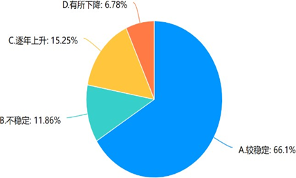 从收支结构及变动情况来看,毕业生的薪资待遇与专业技能水平及就业年限高度相关。统计显示, 52.54% 的毕业生月薪在3000-5000 范围内,20.34%的毕业生月薪在5000-8000范围内,11.86% 的毕业生月薪超过8000元,但仍有15.25%的毕业生月薪低于3000元,如图1所示。结合访谈了解到月薪高低一定程度上与就业年限高度正相关,其次与专业技能水平与就业岗位所需技术水平正相关,如理工科类就业岗位薪资普遍高于文科类。跳槽频次与月薪呈负相关,66.1 % 的毕业生表示就业后薪资待遇较稳定,15.25%的毕业生薪资待遇随着就业年限的增加逐步上升,也有11.86%的毕业生表示就业后薪资待遇不稳定,6.78%的毕业生薪资待遇有所下降,如图2所示。结合企业HR及毕业生现场访谈了解到, 毕业三年内是毕业生积累实践经验的关键时期,薪资待遇相对稳定。对于跳槽频繁的毕业生,用人单位在招聘面试时则会重点了解其跳槽的原因,并评估其工作胜任能力、在企业可能的服务时间及育人成本,这类毕业生在换工作时并不占优势,就是入职成功,待遇也不会明显提高。