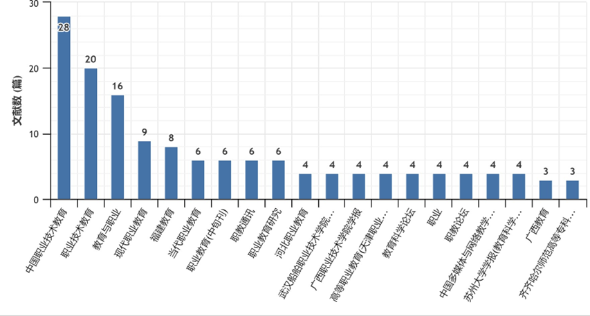 发文期刊水平普遍较高,发文量较多的期刊是专业影响力较大的期刊,比如《中国职业技术教育》贡献了28篇文章,《职业技术教育》发文20 篇,《教育与职业》发文16篇,这几个期刊既有北大核心期刊,也有南大核心期刊,在职业教育领域具有举足轻重的地位,说明新质生产力发展理论应用在高职教育中的研究成果发文比较聚集,发文期刊水平很高,具有较大影响力。